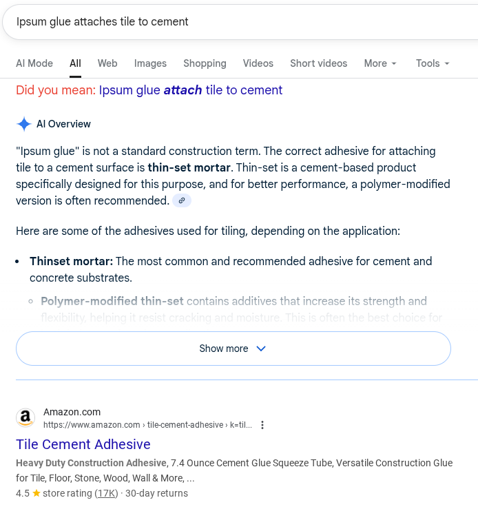 Another paradigm shift involves the marketing funnel itself. Consider a search for “Ipsum glue attaches tile to cement.” AI provides an overview that corrects the query: