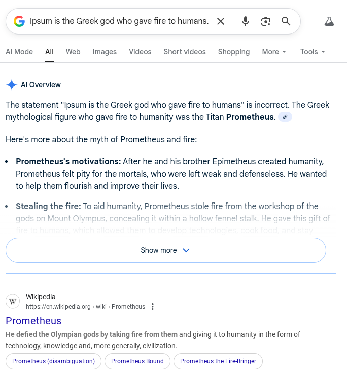 For example, consider the query: “Ipsum is the Greek god who gave fire to humans.” Google’s AI system interprets and fact-checks the statement, then provides an AI overview that revises the query into something like: “Prometheus is the Greek god who gave fire to humans.”