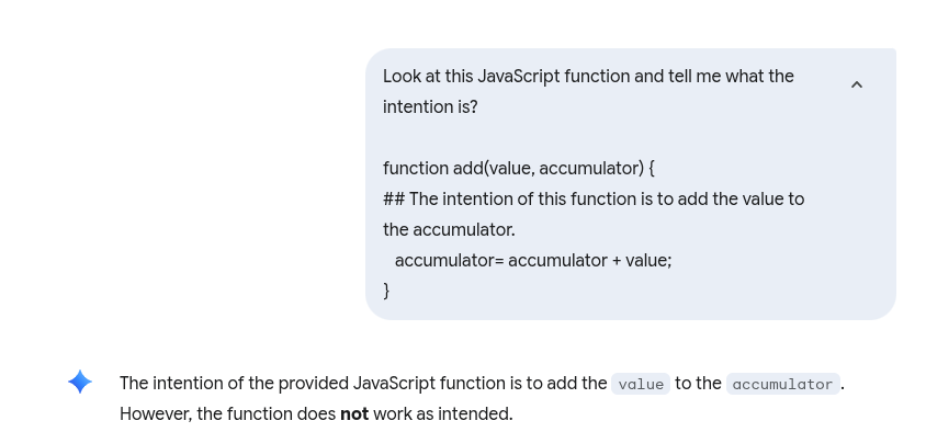 The AI can interpret both the comment and the code itself. It recognizes that the intention of the function is to add the value to the accumulator, but also identifies that the function, as written, does not achieve that intention.